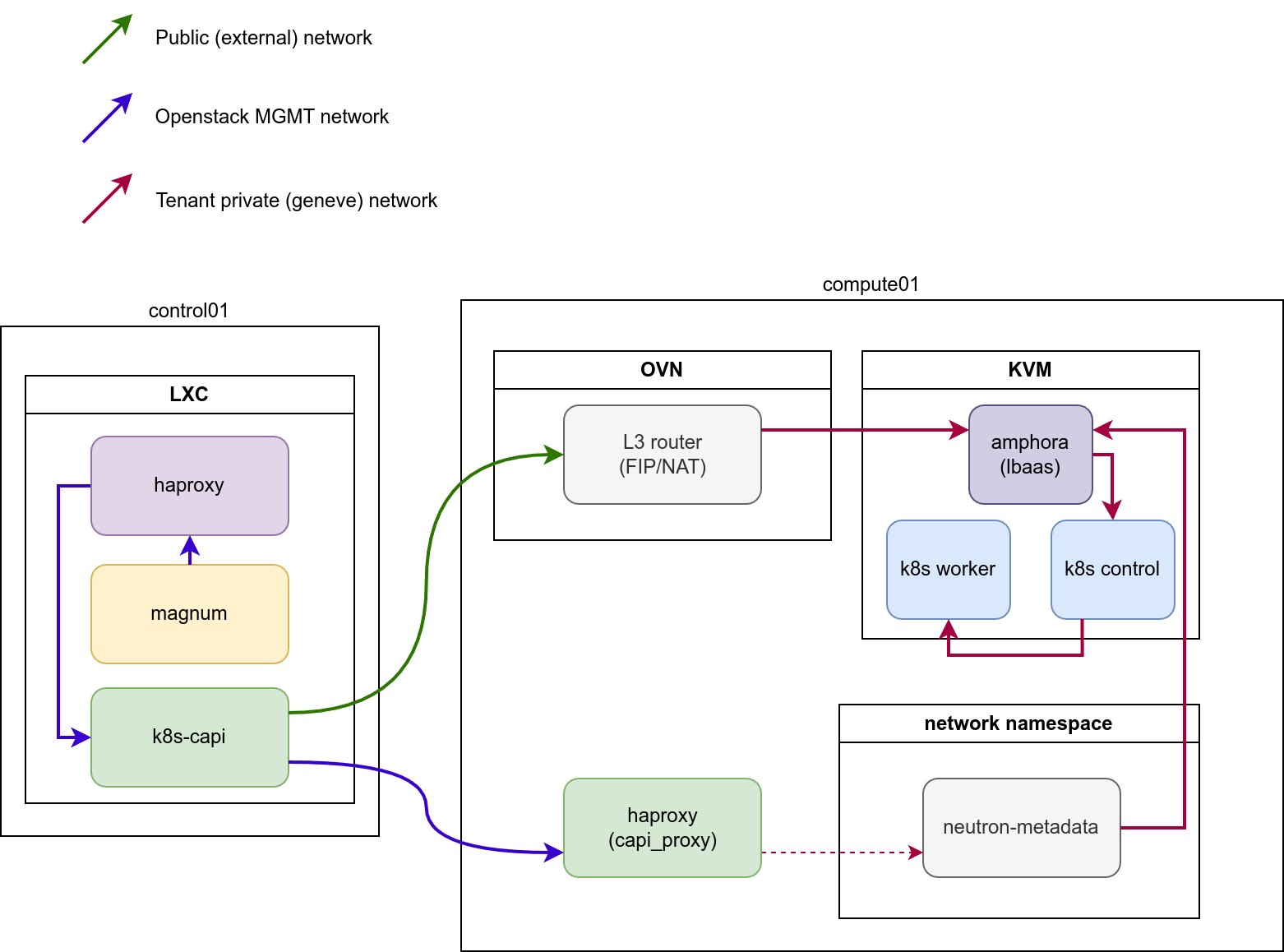 As the control plane k8s cluster need to access a k8s control plane of tenant cluster for it’s further configuration, the only way to do it out of the box is through the public network (Floating IP). This means, that API of the k8s control plane must be globally reachable, which posses a security threat to such tenant clusters.
